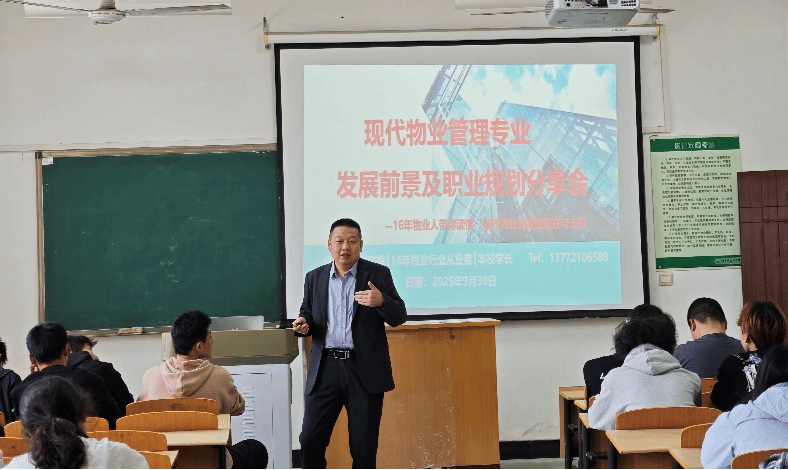 9月30日上午9时,我院特邀优秀毕业生、拥有16年物业从业经验的张文辉学长返校,开展现代物业管理发展前景及职业规划分享会。作为行业资深专家,张总结合自身从一线管理员到企业高管的成长历程,系统梳理了物业管理行业的发展脉络。针对行业趋势,张总重点分析了三大方向:一是智能化管理普及,物联网、AI技术将重构服务流程;二是绿色环保深化,太阳能应用、雨水回收系统等将成为项目标配;三是社区服务多元化,家政、健康管理等增值服务市场规模将突破千亿元。张总的分享会让新生们豁然开朗。