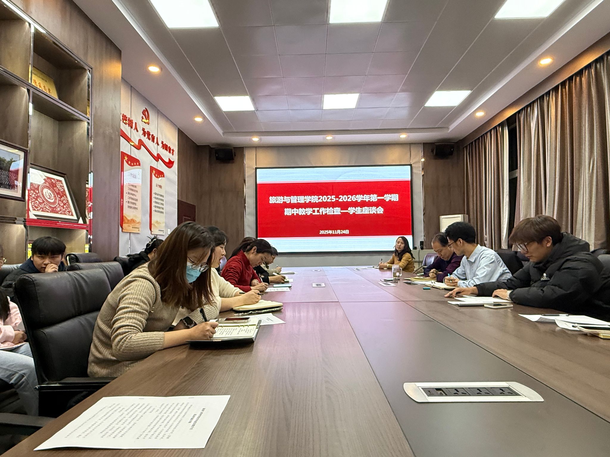 为深入了解教学情况,提升教学质量,11月24日晚,旅游与管理学院于学院会议室召开了2025-2026学年第一学期期中教学检查学生座谈会。院长王红相、院办主任党娜、各专业带头人、公共课部教师代表、两办工作人员及学生代表30余人参与此次会议。