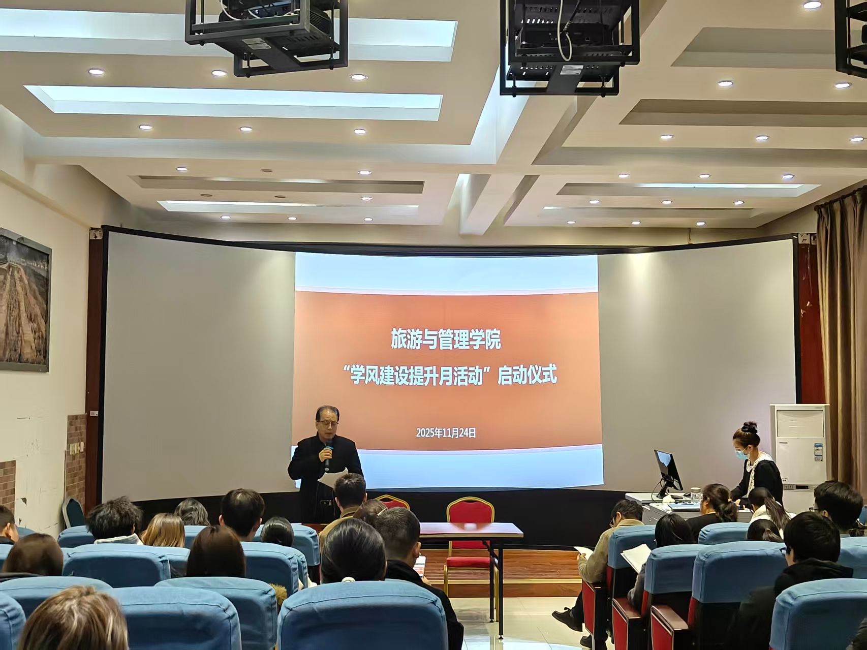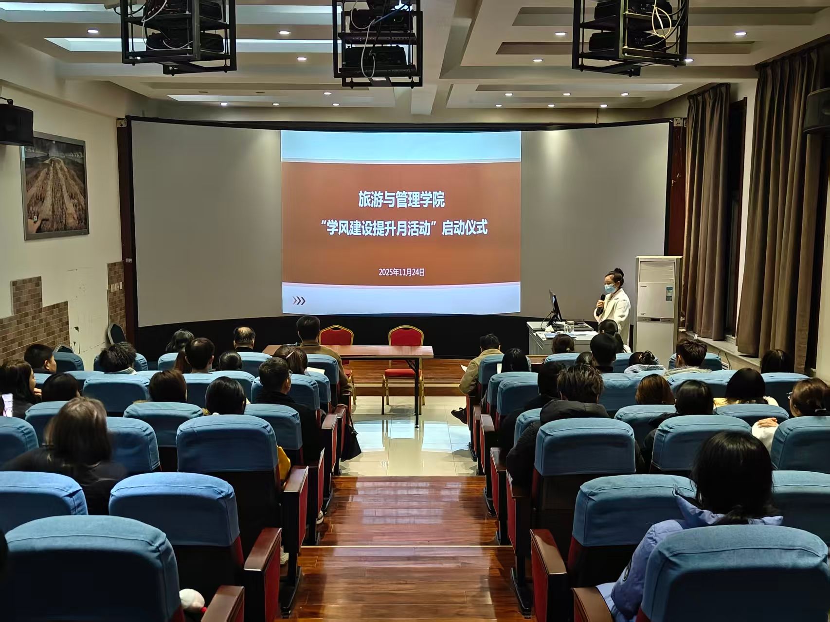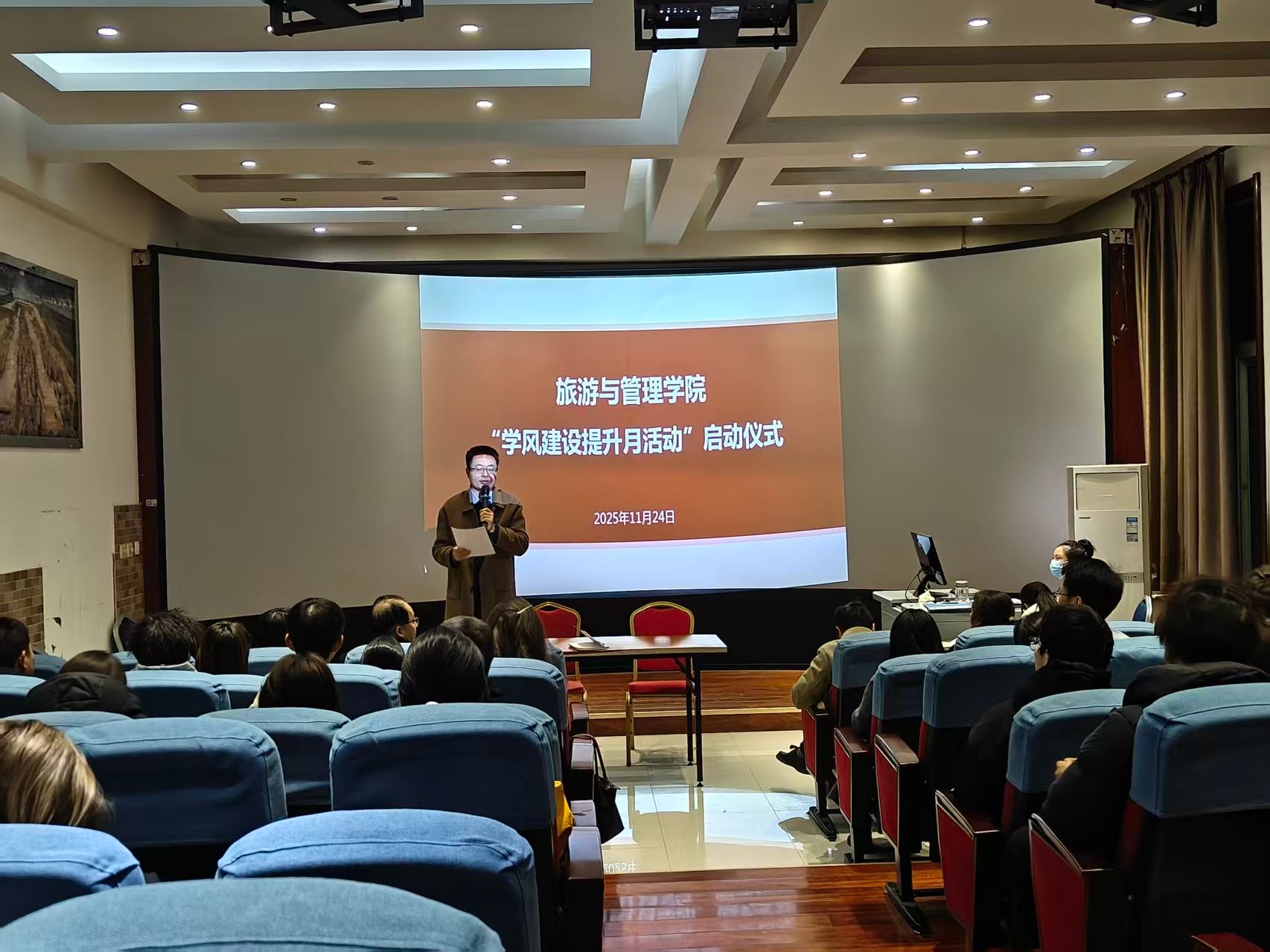 为切实改善学风现状,旅游与管理学院以期中教学检查为契机,于11月24日晚在行知楼BOA508室举行学风建设提升月活动启动仪式,学院领导、专业带头人、两办工作人员及学生代表80余人参会。活动以“强规矩、促学风、保质量”为主题,将从11月25日持续至12月24日,覆盖全院学生。
