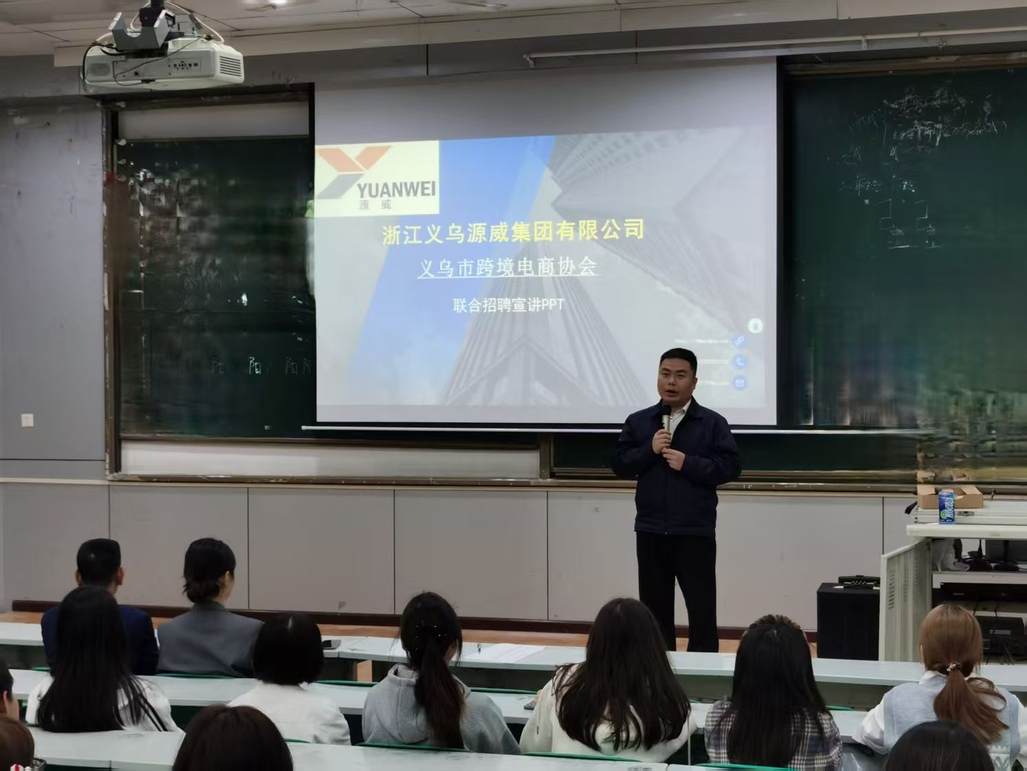 随后,文化教研室主任苟老师简要介绍了前来宣讲的两家企业:义乌源威网络科技有限公司和浙江银都酒店管理有限公司,并请两家企业依次开始宣讲。首先进行宣讲的是义乌源威网络科技有限公司。该公司人力资源部经理王总从公司简介、岗位设置、薪资待遇和晋升通道4个方面,进行了详细地介绍,并邀请同学们进入微信群聊,以便进一步交流。紧接着,浙江银都酒店管理有限公司的孙总及助理,简要介绍了本公司的业务范围、组织结构、招聘岗位和薪资福利,并面对面建立微信群,以便同学们了解更多信息。两家企业负责人都表示,欢迎同学们到义乌“走一走,看一看”,探索更多发展可能,寻找职业发展机遇。