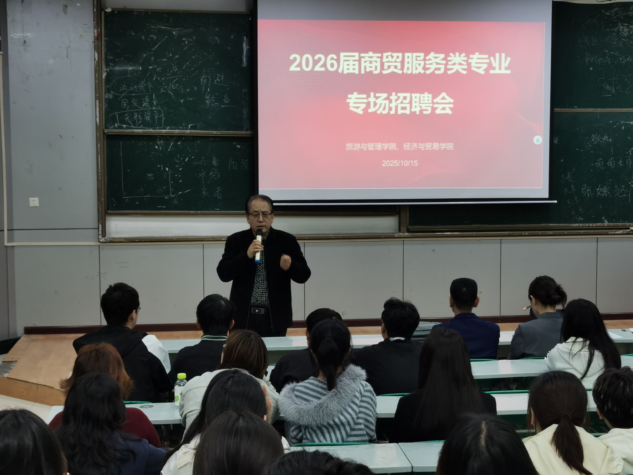 2025年10月15日晚,旅游与管理学院应用英语专业2026届毕业生浙江企业专场招聘会在致用楼北二楼台阶教室举行。会议伊始,旅游与管理学院王院长作了开场讲话。他指出,当今就业形势严峻,作为即将毕业的大学生,要端正就业、择业的态度,积极参与到就业实践中来,以期获得与自身能力匹配的工作。
