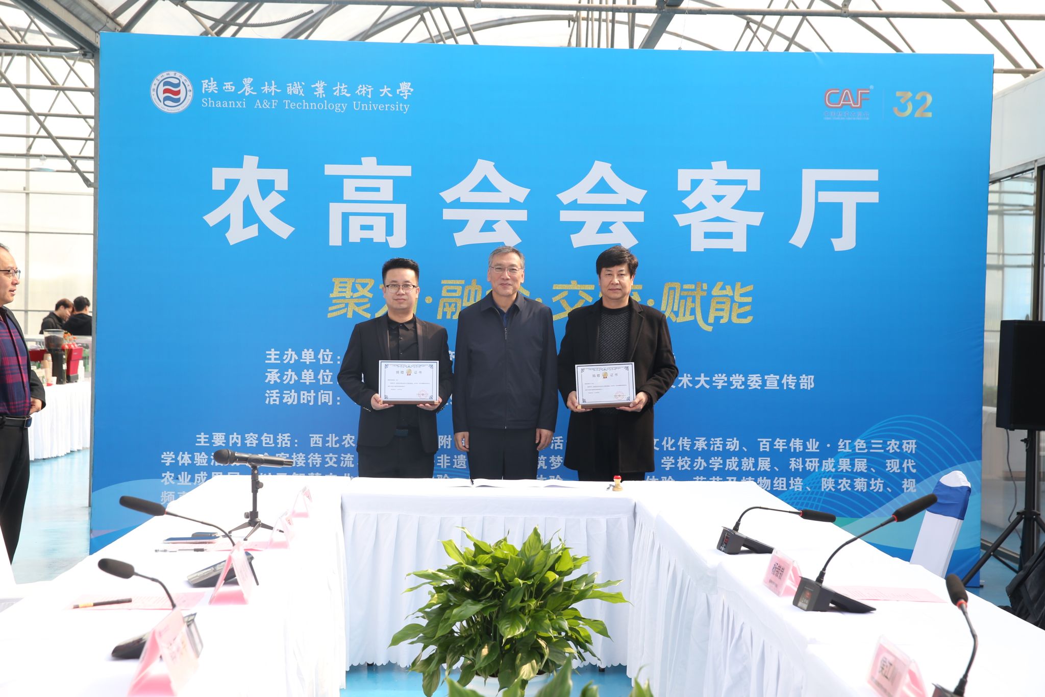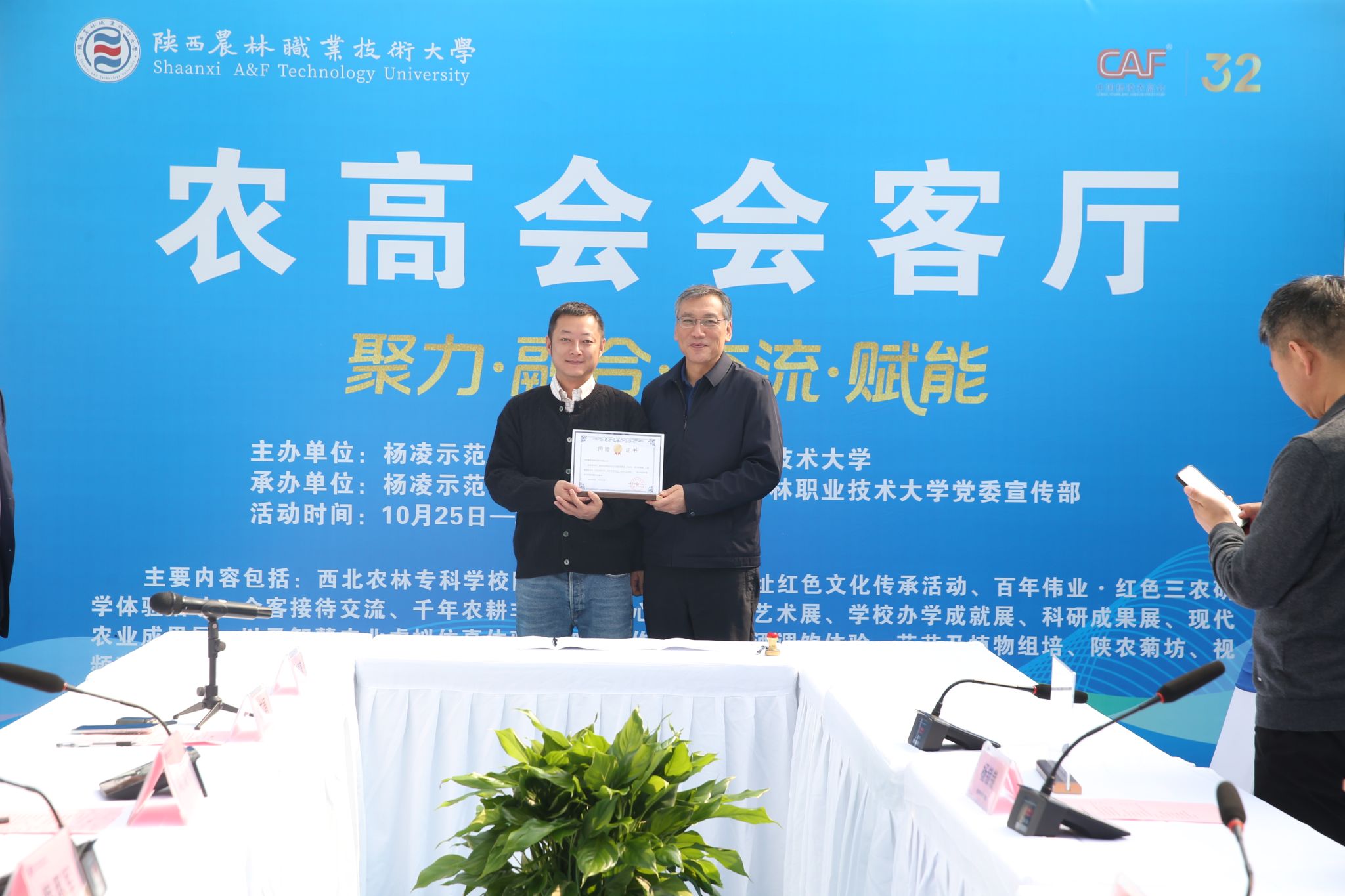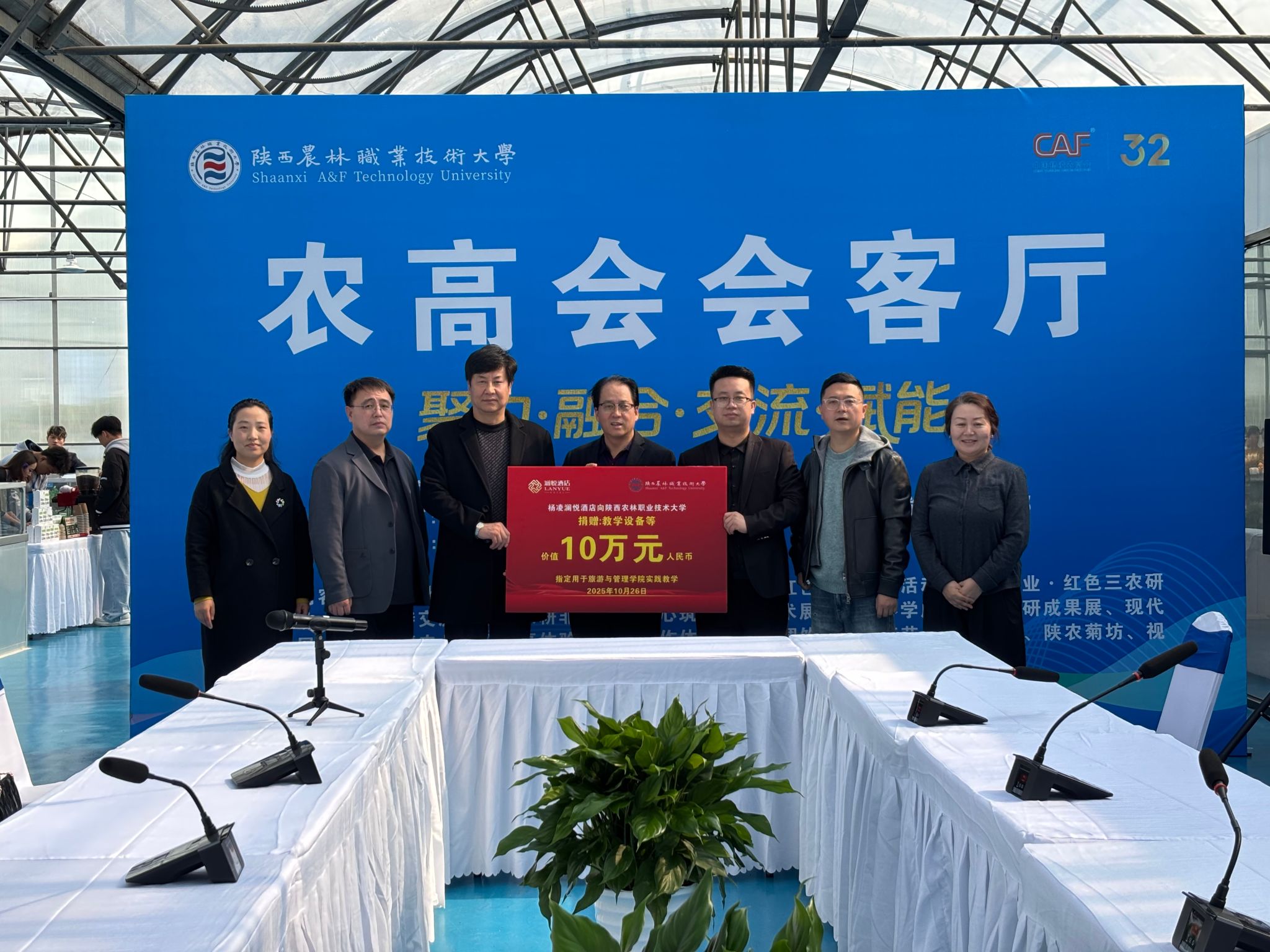 2025年10月26日上午,陕西农林职业技术大学在农高会会客厅隆重举办企业捐赠仪式。学校党委书记韩明军,党委副书记刘瑞明,西北农林科技大学葡萄酒学院党总支书记郭建东,桥畔葡萄酒集团股份有限公司董事长侯江川、总工陈晓,杨凌澜悦铂莱酒店管理有限公司董事长杨锁锁、总经理罗杰,旅游与管理学院负责人等共同参加捐赠仪式。