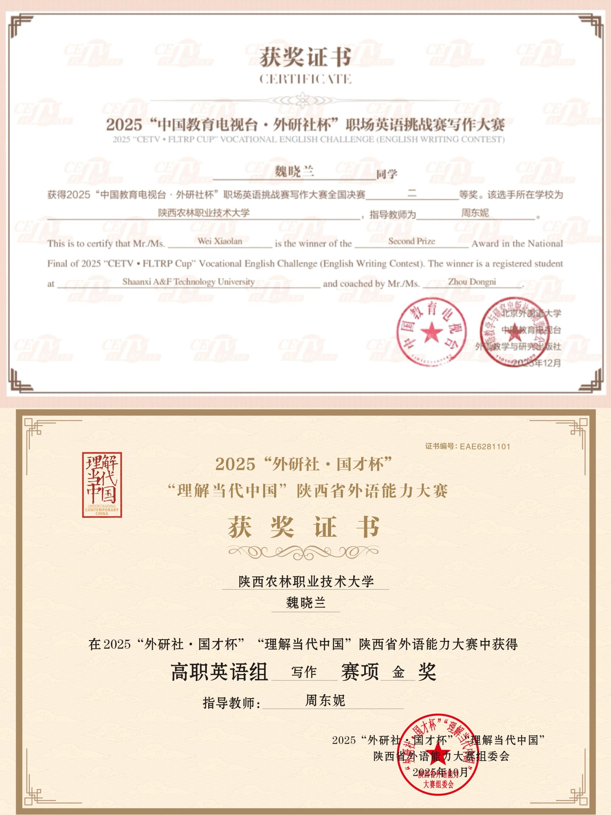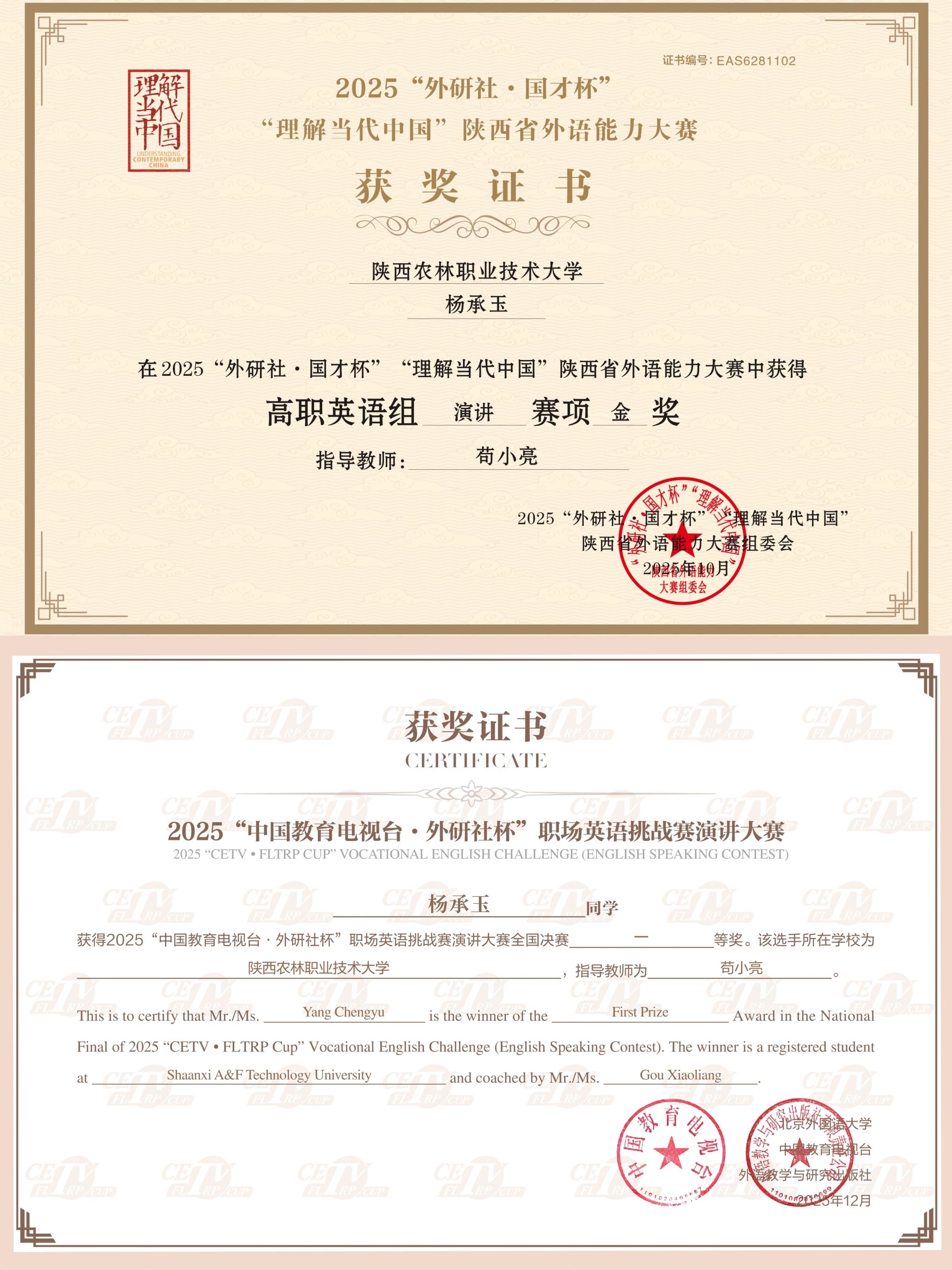 近期,从两项高端外语赛事接连传来捷报,陕西农林职业技术大学旅游与管理学院应用英语专业师生团队佳绩频传,实现了历史性突破。继10月底在由陕西省教育厅主办的2025“外研社·国才杯”陕西省外语能力大赛中斩获两项特等奖后,在12月刚刚落幕的、由教育部直属单位北京外国语大学等主办的2025“中国教育电视台·外研社杯”职场英语挑战赛全国总决赛中,该专业学子再创辉煌:杨承玉同学荣获英语演讲赛项全国一等奖,魏晓兰同学荣获英语写作赛项全国二等奖,常璐璐同学团队荣获英语短视频赛项优秀奖。这是我校乃至我省在此项赛事中取得的最好综合成绩,标志着应用英语专业人才培养质量迈上了新台阶。